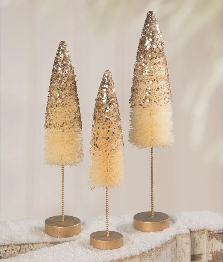 Bring serene elegance to your holiday decor with these cream-colored bottle brush trees sprinkled with gold glitter.