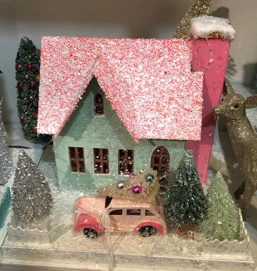 Give your Christmas village retro appeal with this Green & Pink Putz House with Car.
