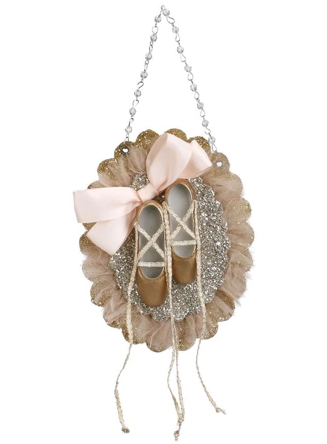 Celebrate your ballerina and show your love for Ballet with this charming golden ballerina shoe ornament with pink ribbon and tulle accents.