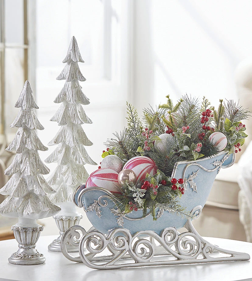 Give your Christmas decor designer appeal with this Elegant Blue and Silver Sleigh.