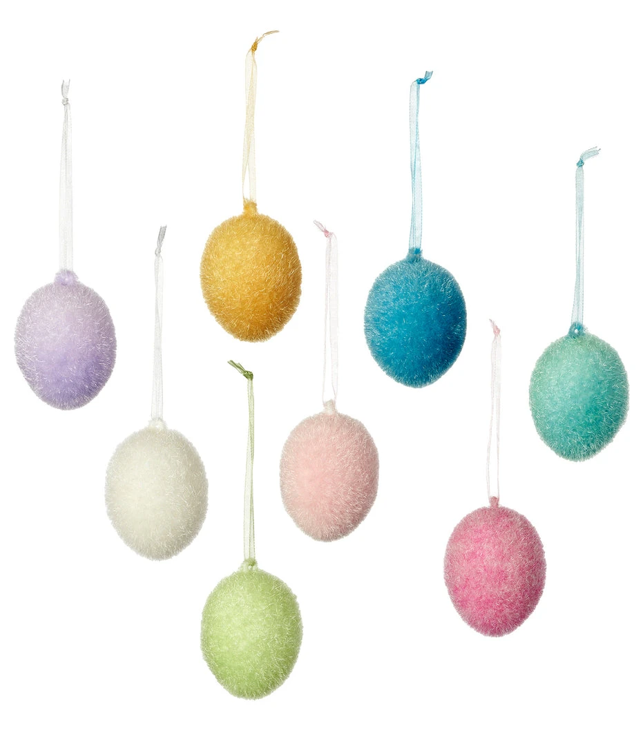 - Flocked egg ornaments with ribbon hanger