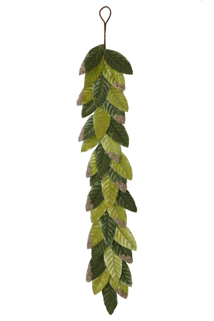 Give you’re decorating a designer look with this variegated green flocked leaf garland with glitter.