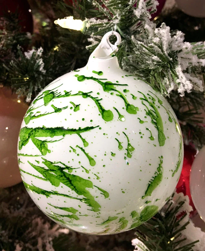 Get artistic with your Christmas decor with these stylish white and green glass ball ornaments by designer Jim Marvin.